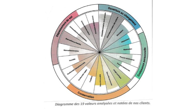 Ainsi, Aristée, analyse les valeurs de ses clients en les répartissant et les notant, sur le diagramme (Cf. image 2), selon 19 d’entre elles. Ces 19 valeurs sont: